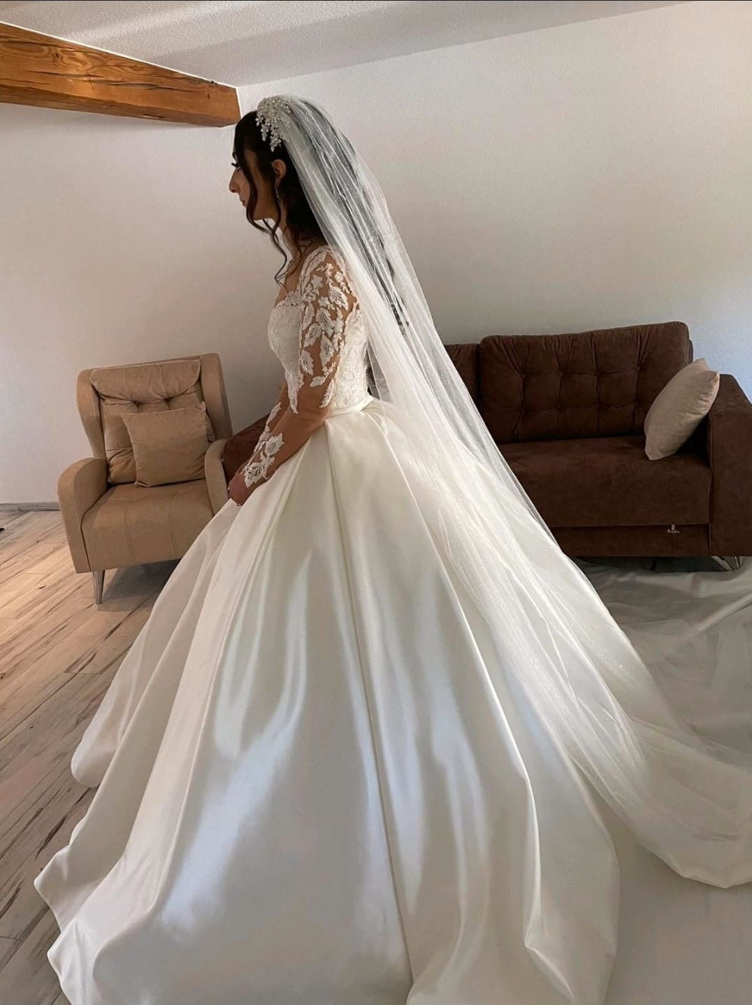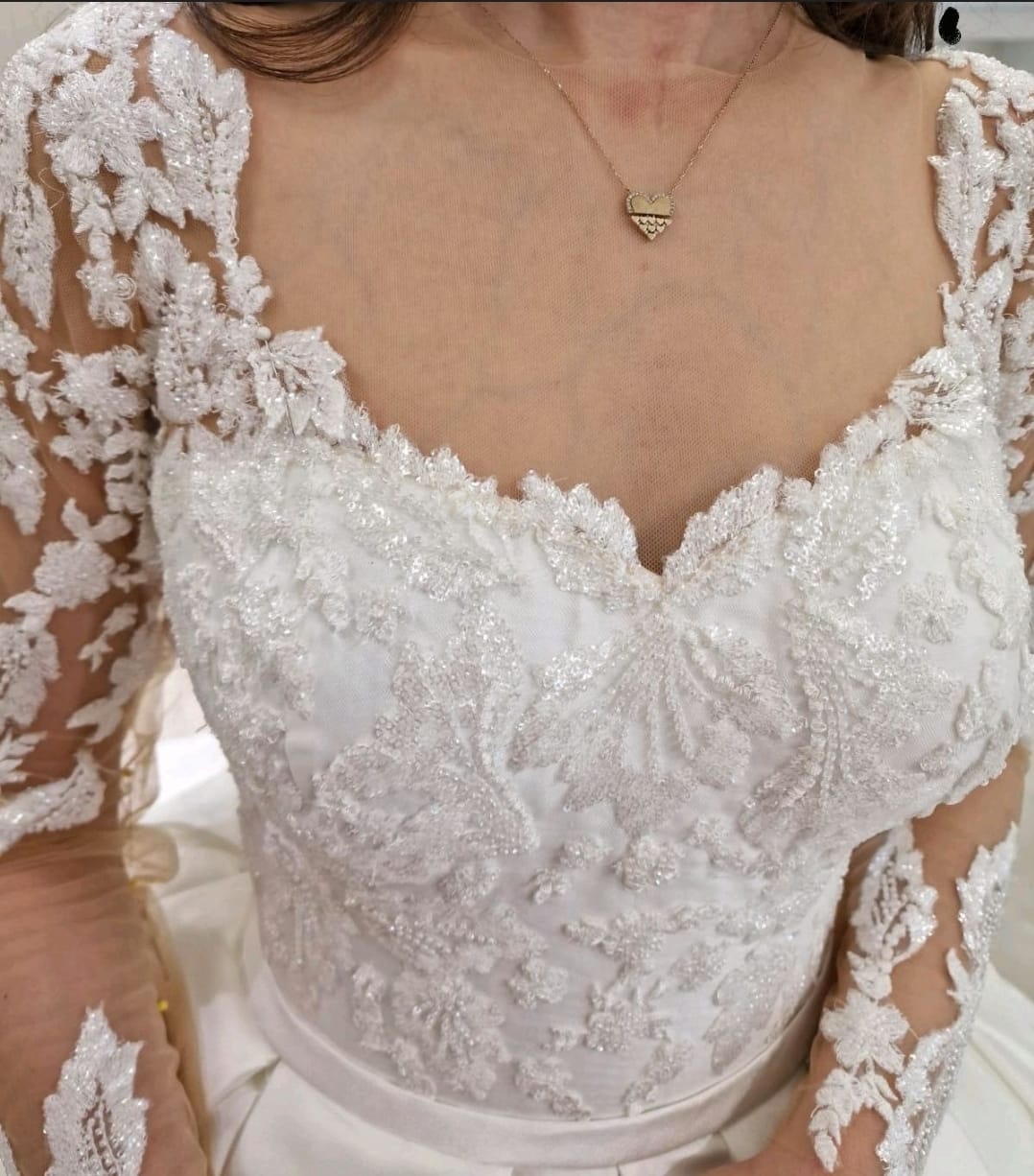 Es ist in einem einwandfreien Zustand und wurde 1 mal getragen. Dazu kommen der Schleier 3m lang glitzer mit Gebrauchsspuren und ein wunderschöner Haarschmuck. Der Neupreis liegt bei 2500€ der angebotene preis ist verhandelbar.