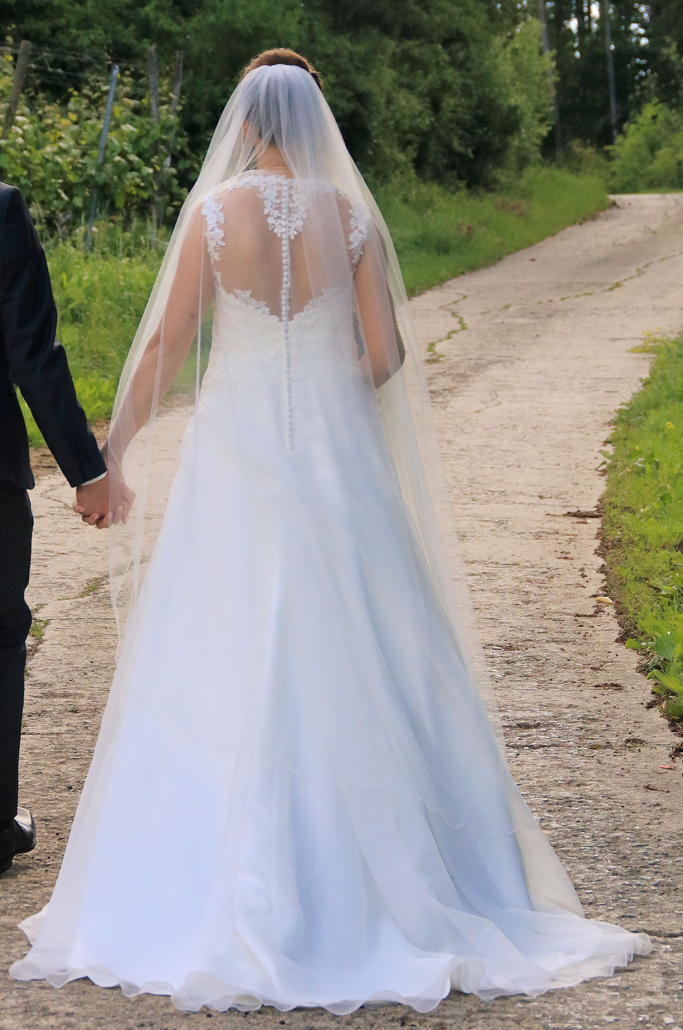 Das Kleid ist in A Linie geschnitten, hat eine Schleppe und einen wunderschönen Rückenausschnitt.
