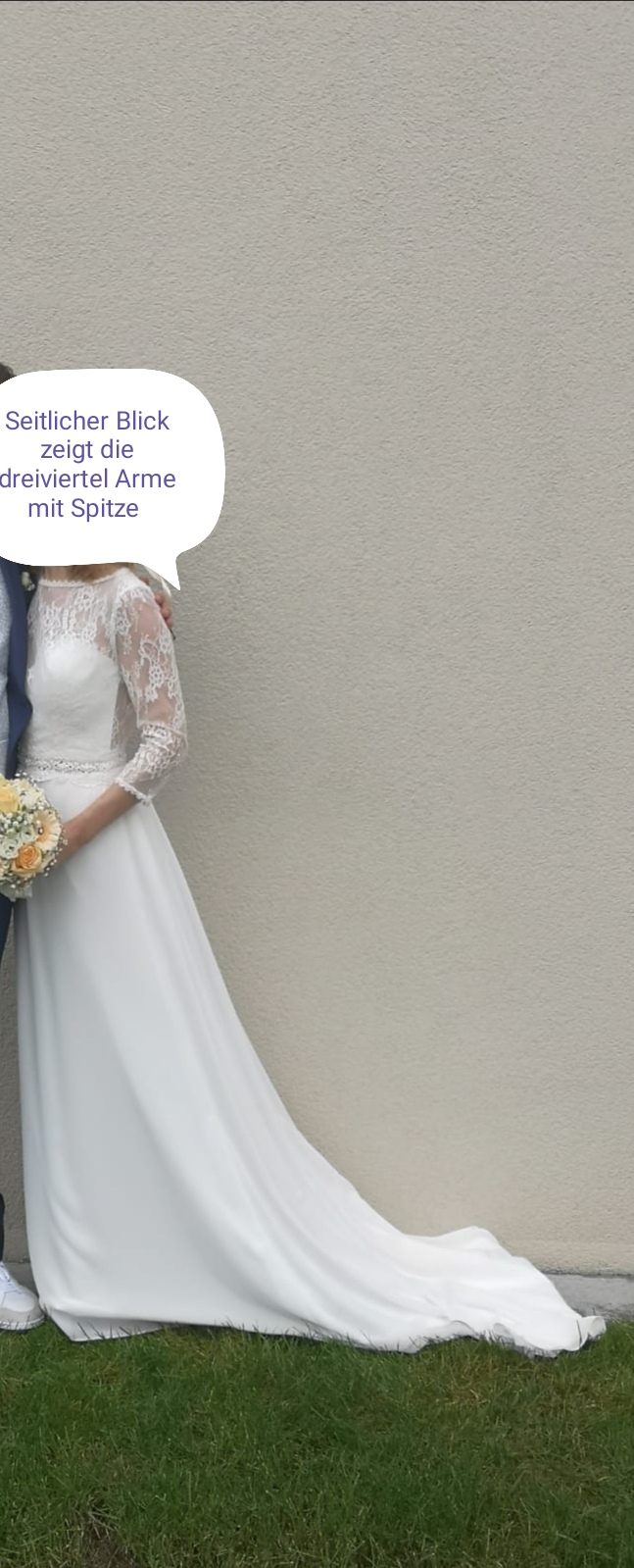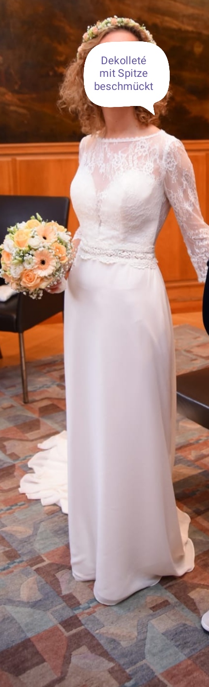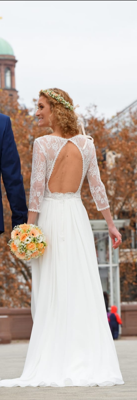 Ich verkaufe mein wunderschönes Brautkleid(Originalpreis 1200€) frisch aus der Reinigung für 450€. Es wurde nur einmal getragen und ist makellos.