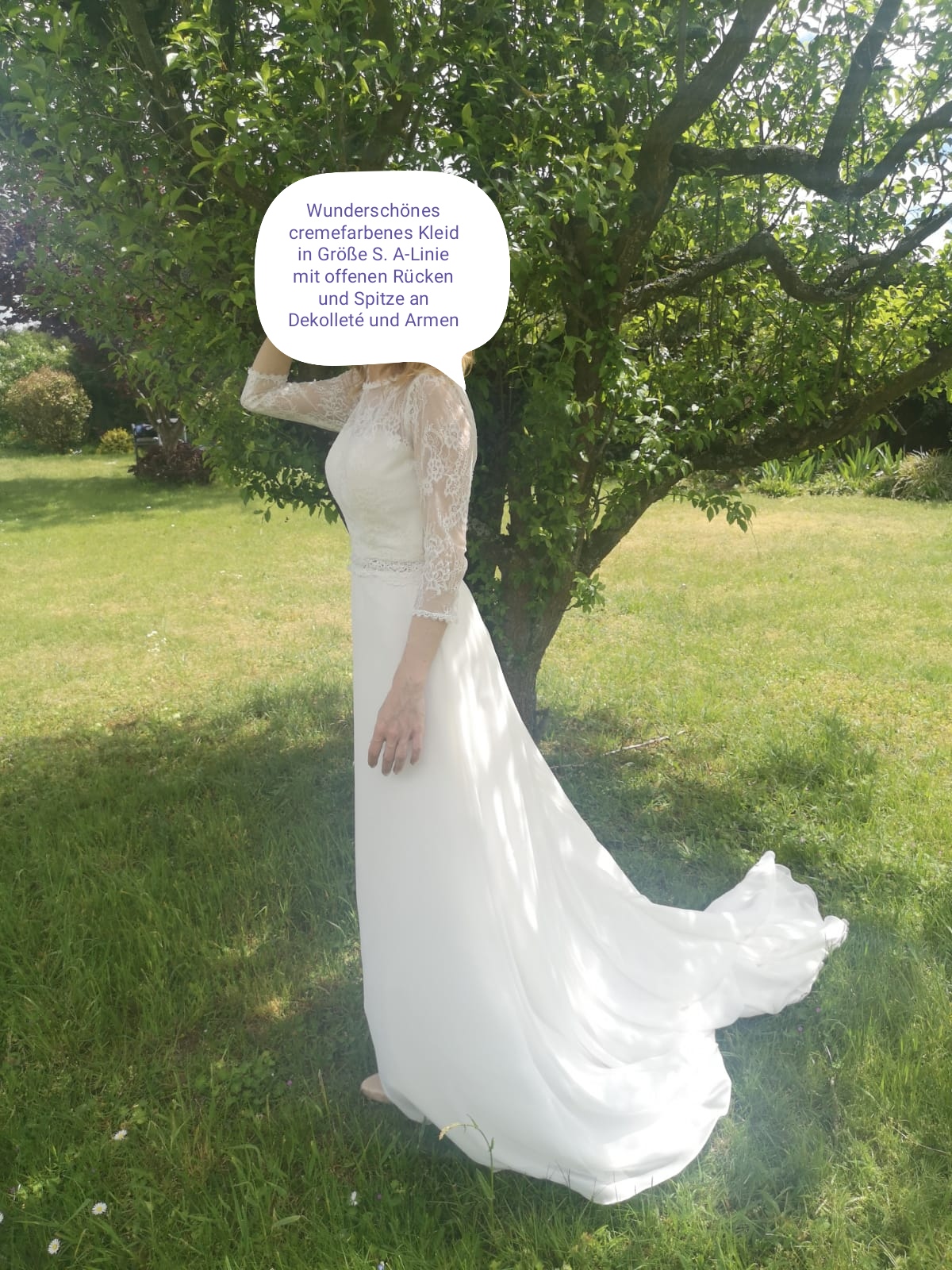 Es ist in A-line geschnitten, mit einem freien Rücken und bezaubernder Spitze an Armen wie Dekolleté. Die Größe ist S. (34-36). Ich selbst bin 1,64cm groß.
