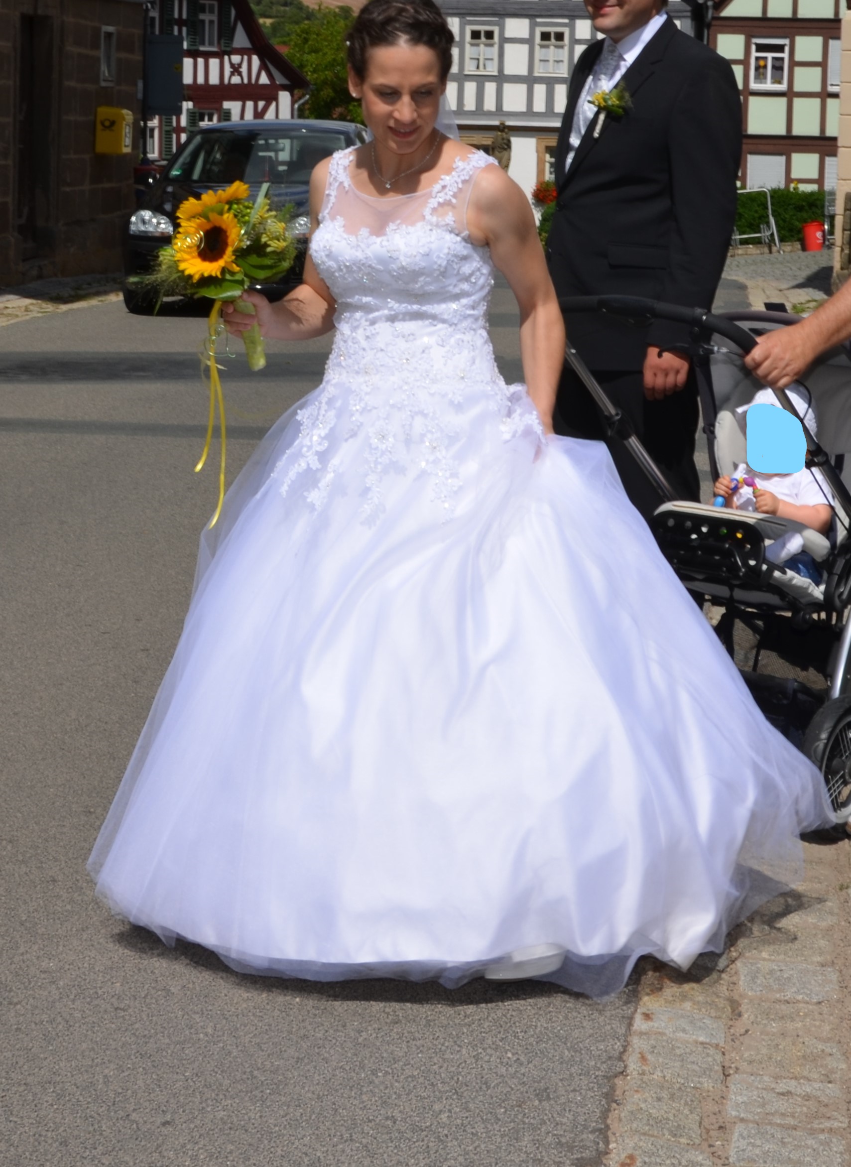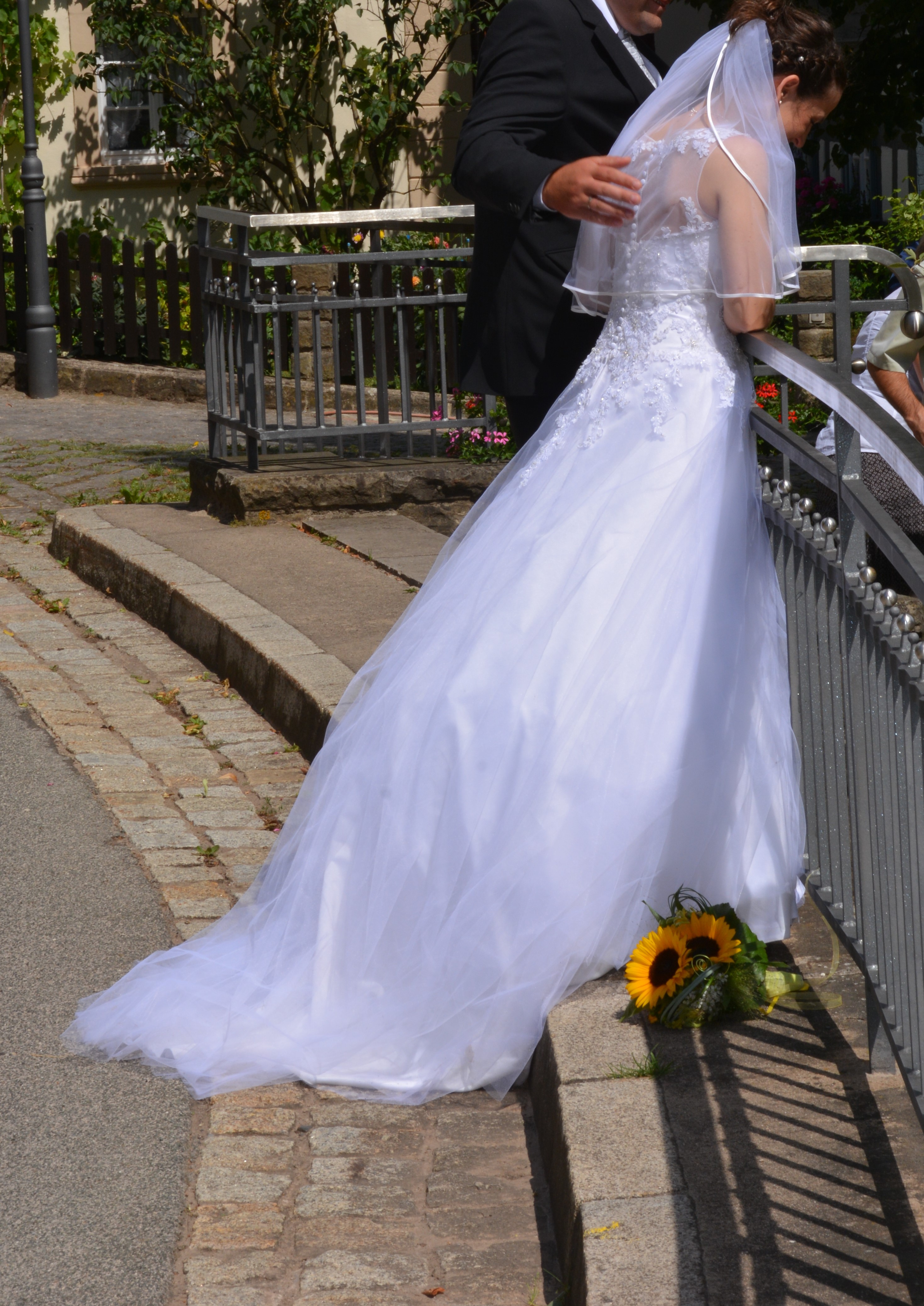 Das Kleid wurde direkt nach der Hochzeit professionell in der Reinigung gereinigt und sofort im verschlossenen Kleidersack aufbewahrt. Leider fiel mir nach der Reinigung ein Loch am unteren, hinteren Rocksaum auf. Einer Schneiderin habe ich dieses gezeigt. Sie sagt, es sei gar kein Problem das Loch zu entfernen, da jede Menge Stoff da ist und das Loch sehr weit unten ist. Ich würde mich sehr freuen, wenn mein Kleid auf diesem Weg eine neue, glückliche Besitzerin findet, die es genauso liebt, wie ich. Bei Fragen, dem Wunsch nach weiteren oder anderen Bildern, meldet euch gerne jederzeit!