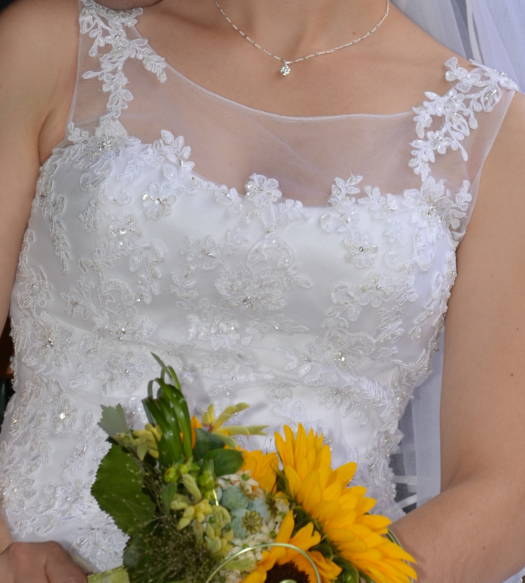 Wunderschönes Brautkleid, mit aufgenähten Perlen und teilweise durchsichtigem Dekollete und Rückenteil. Die Schleppe kann beim Tanzen hoch gesteckt werden (versteckter Knopf unter dem Kleid), oder an einer Schlaufe gehalten werden. Geschlossen wird das Kleid mit Knöpfen am Rückenteil.