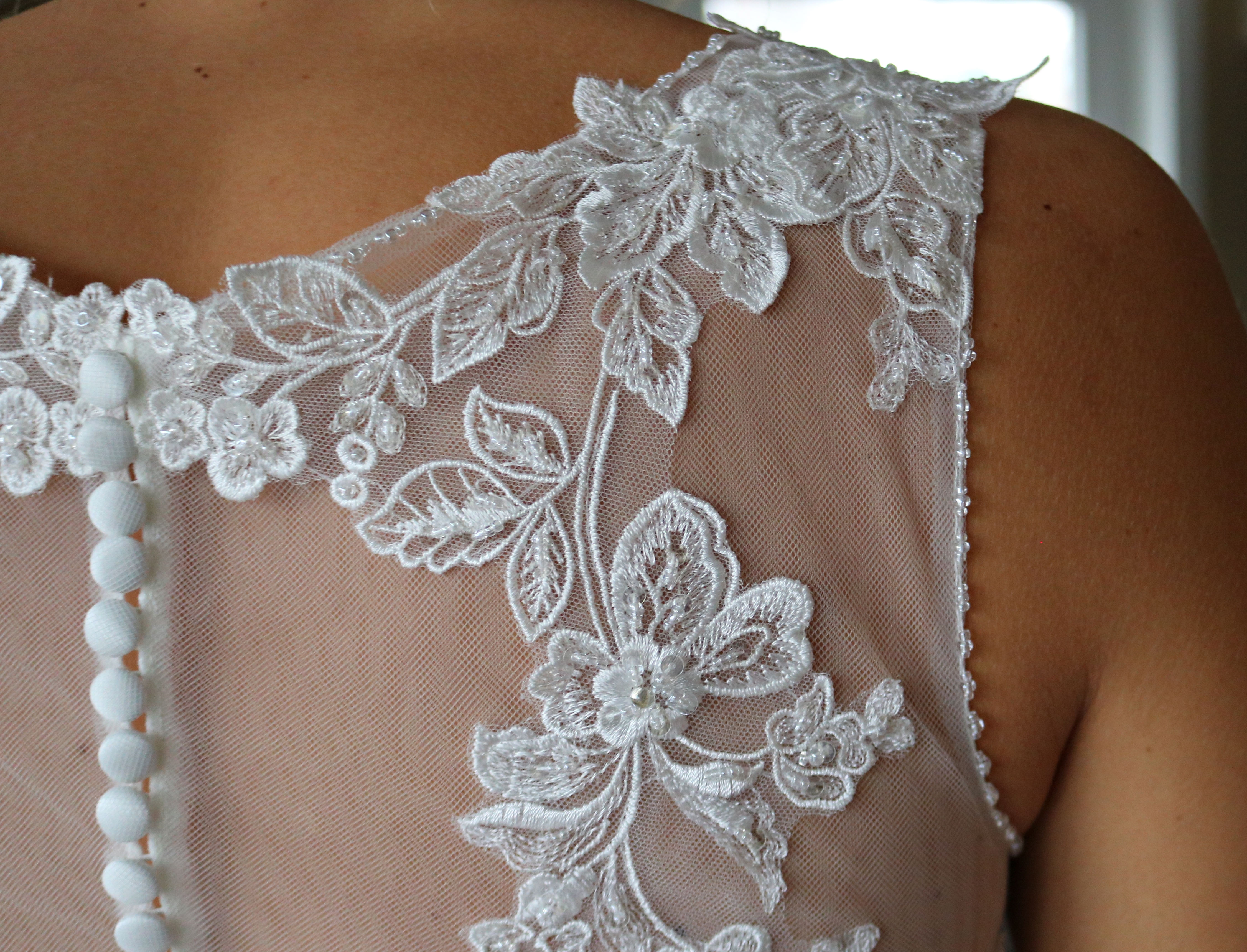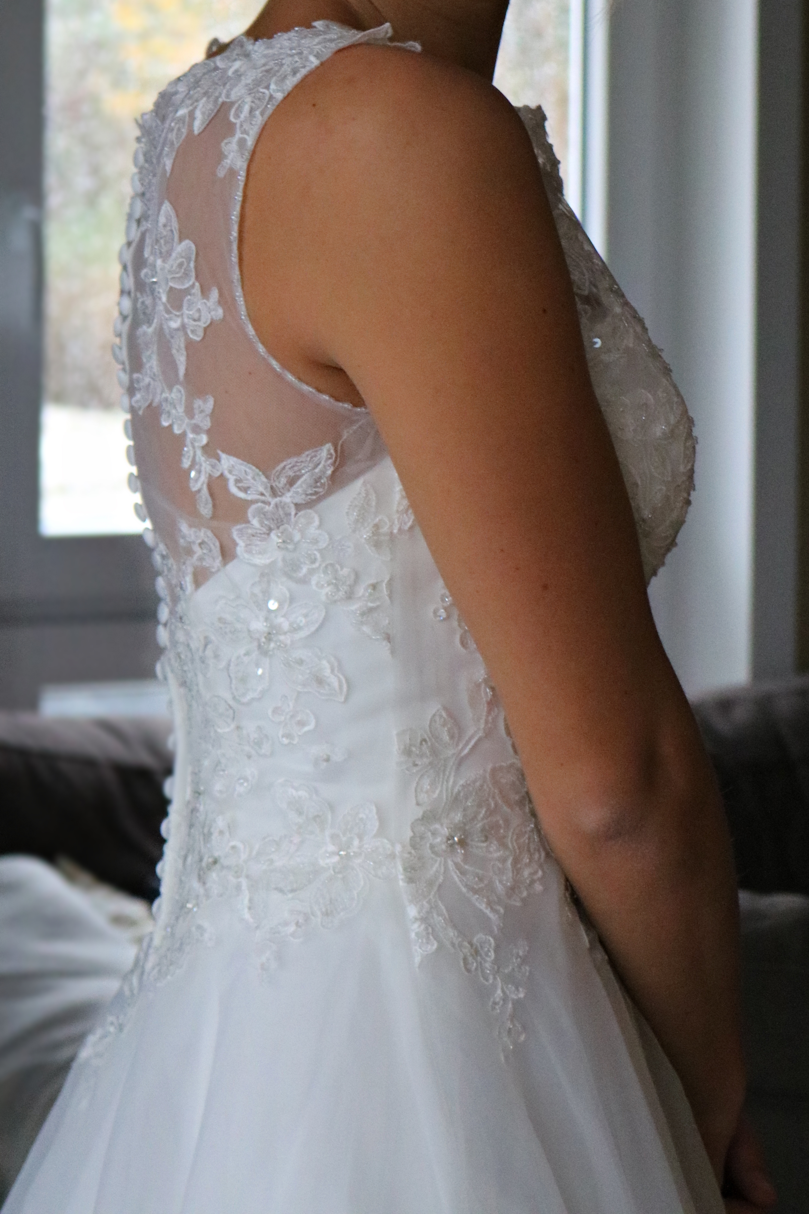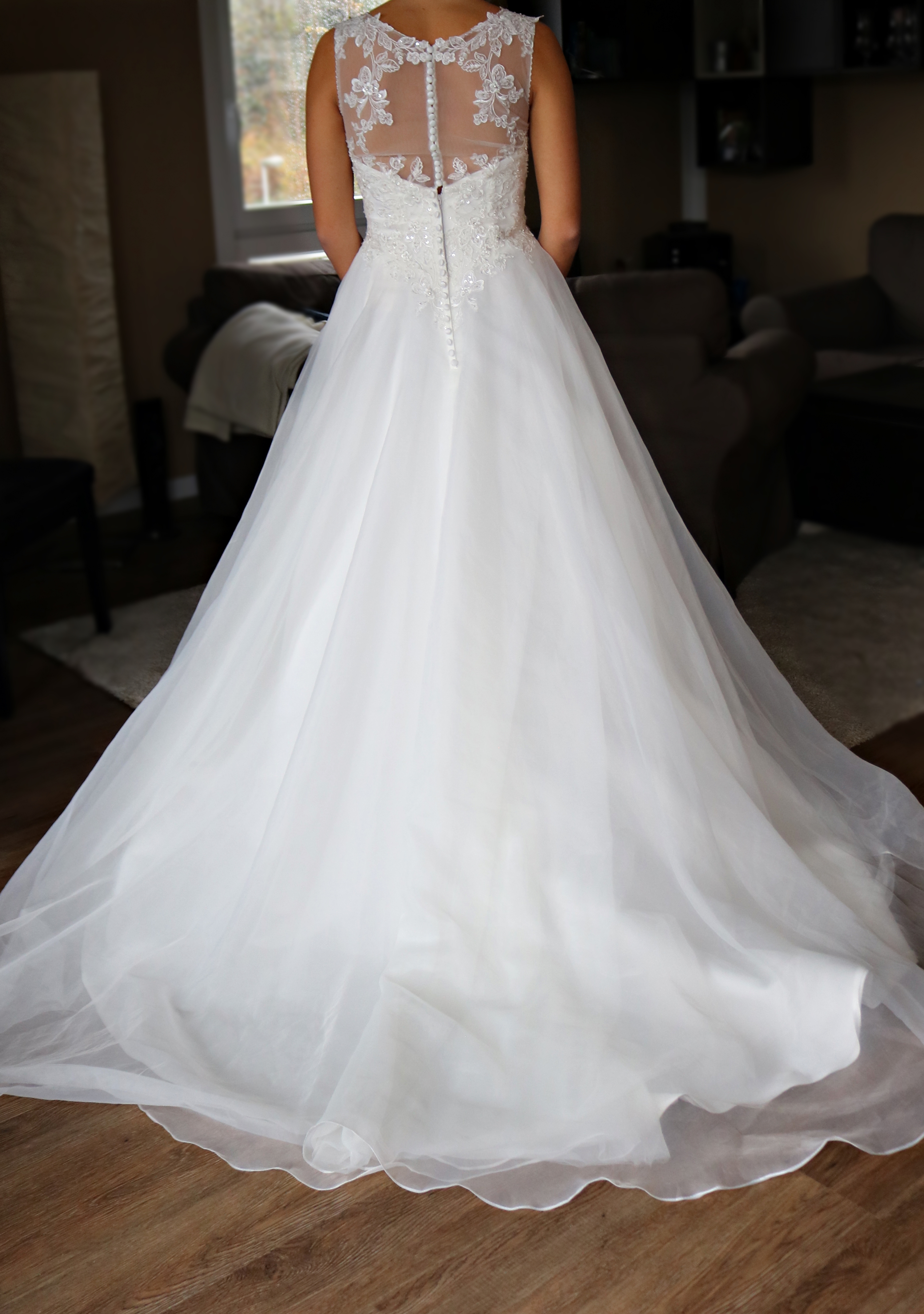 Der Stoff ist kein Tüll, sondern Organza, was das Kleid etwas weicher wirken lässt. Ich liebe außerdem die lange Schleppe an dem Kleid und die vielen liebevollen Details. Am Ärmel verläuft eine Reihe kleiner Perlen, das Spitzenmuster ist modern und auf keinen Fall langweilig.