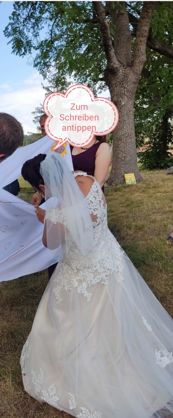Verkaufe hier mein wunderschönes Brautkleid in creme/ weiß. 1x getragen, wie neu. Ich bin 1.55m gross mit Schuhen 1.60 m auf diese Länge wurde das Kleid gekürzt. Es hat eine lange schleppe, die zum Tanzen hochgesteckt werden kann. Viel spitze, zum Teil offener rücken. Reißverschluss und Knöpfe am Rücken. Das Kleid sieht mit und ohne Reifrock toll aus (gibt es dazu) Neupreis lag bei 3.200 Euro. Das Kleid wurde professionell gereinigt und ist wie neu. Den Reifrock ist von Poirier. XL steht drinne fällt jedoch wie eine 38 aus