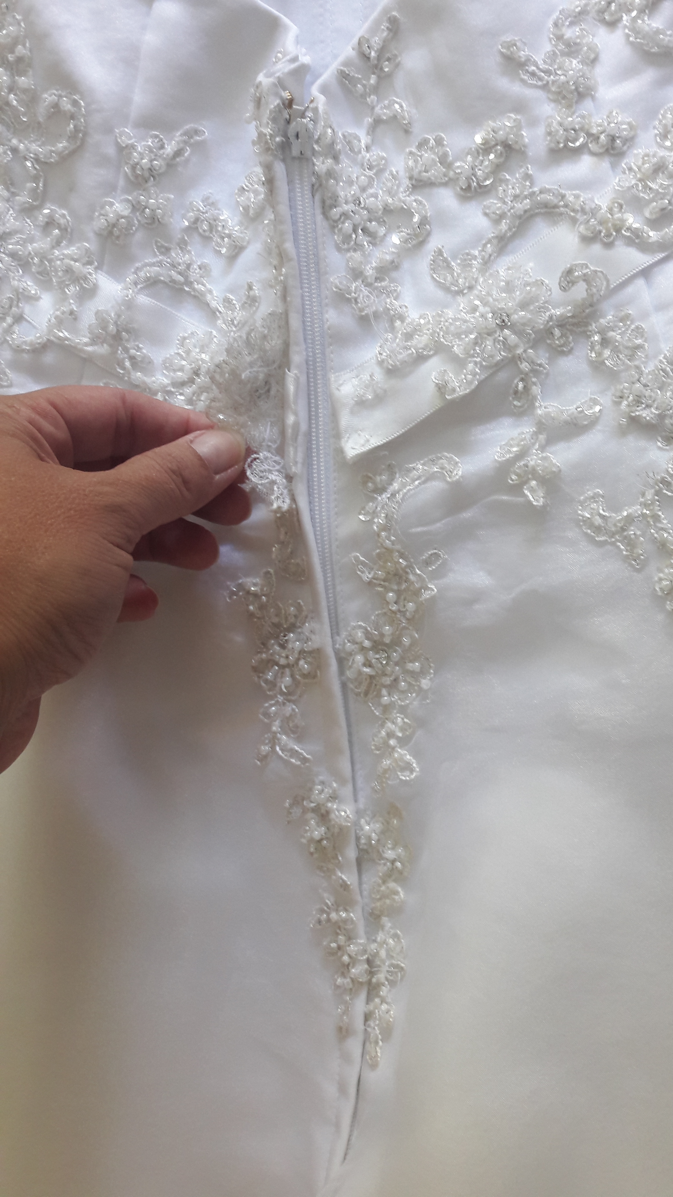 Farbe weiß mit Perlen und Spitze überall am Kleid.