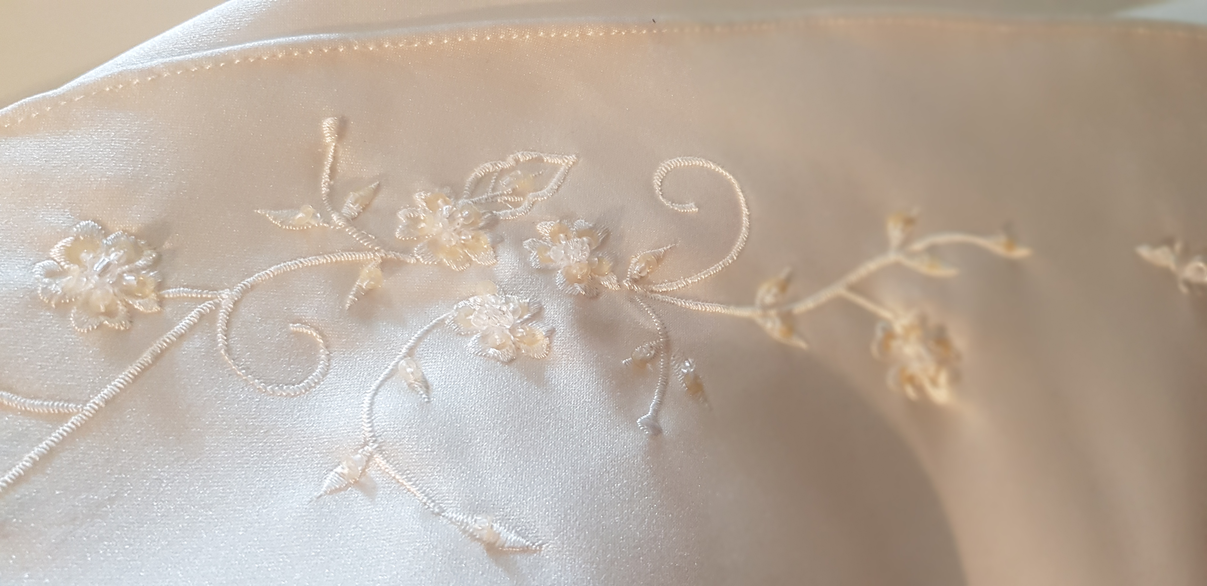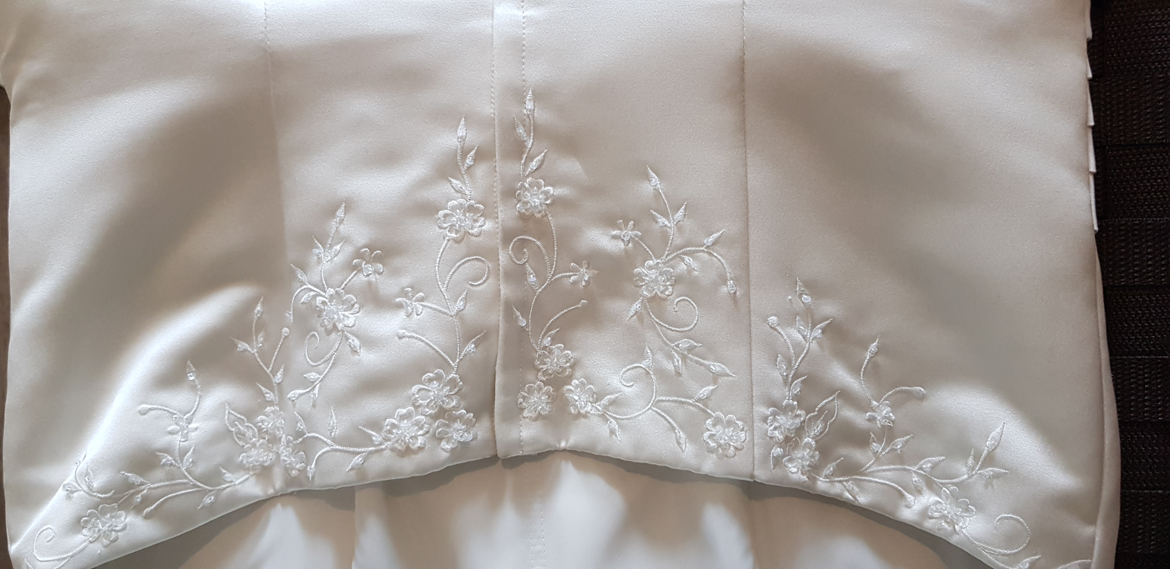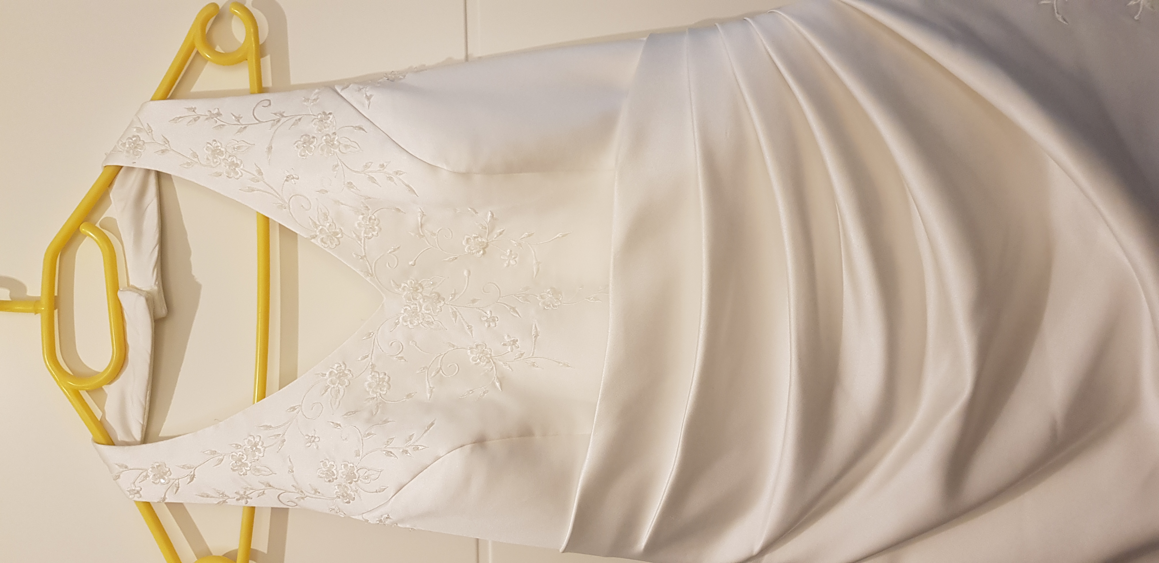 Das Kleid ist Creme-weiss, ist an der Taille gerafft . Ist im Ausschnitt mit kleinen Perlen bestickt sowie am unteren Teil des Kleides. Hat eine kleine Schleppe. Sehr bequem zu tragen habe mich sehr wohl gefühlt.Das Kleid wurde professionell gereinigt.