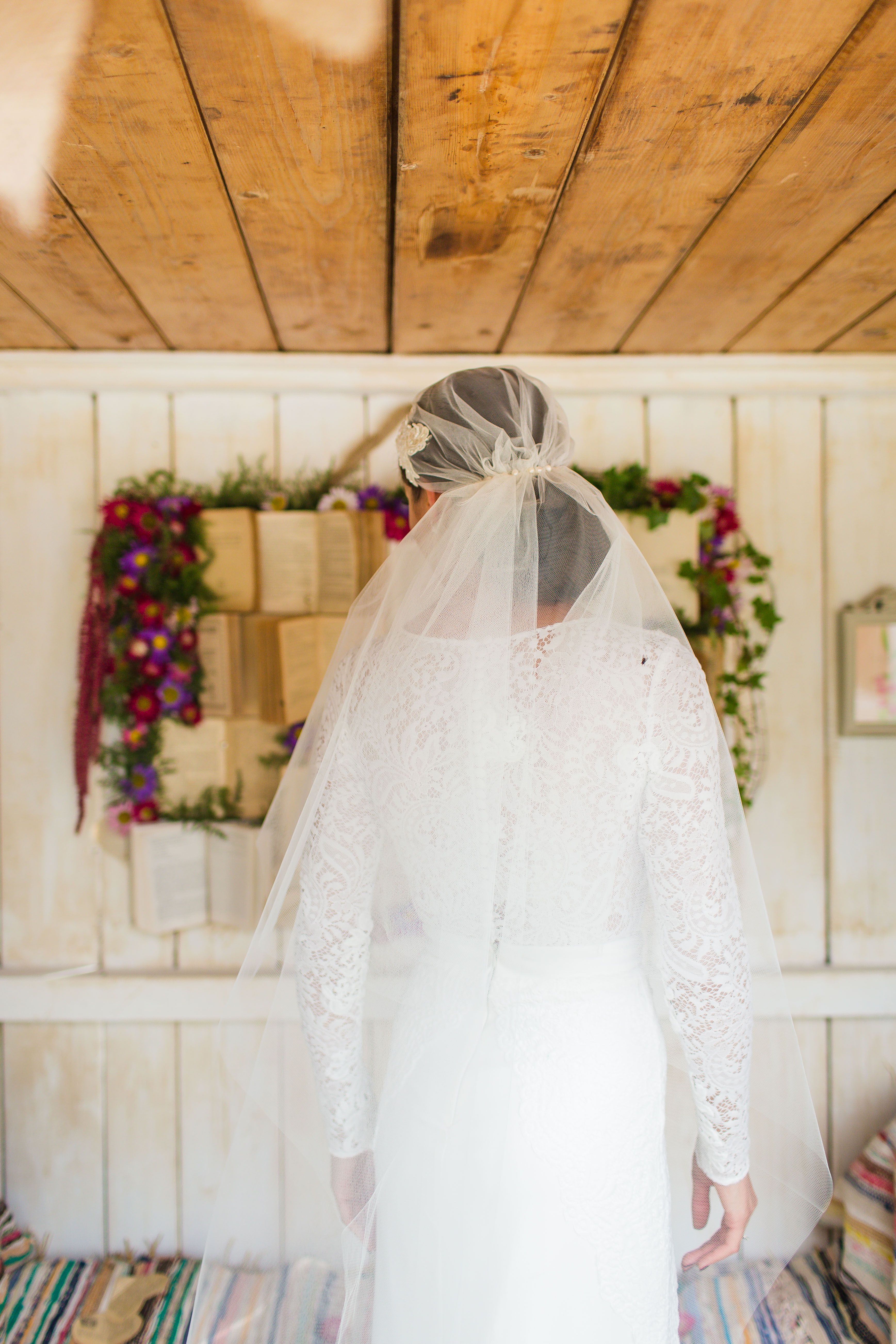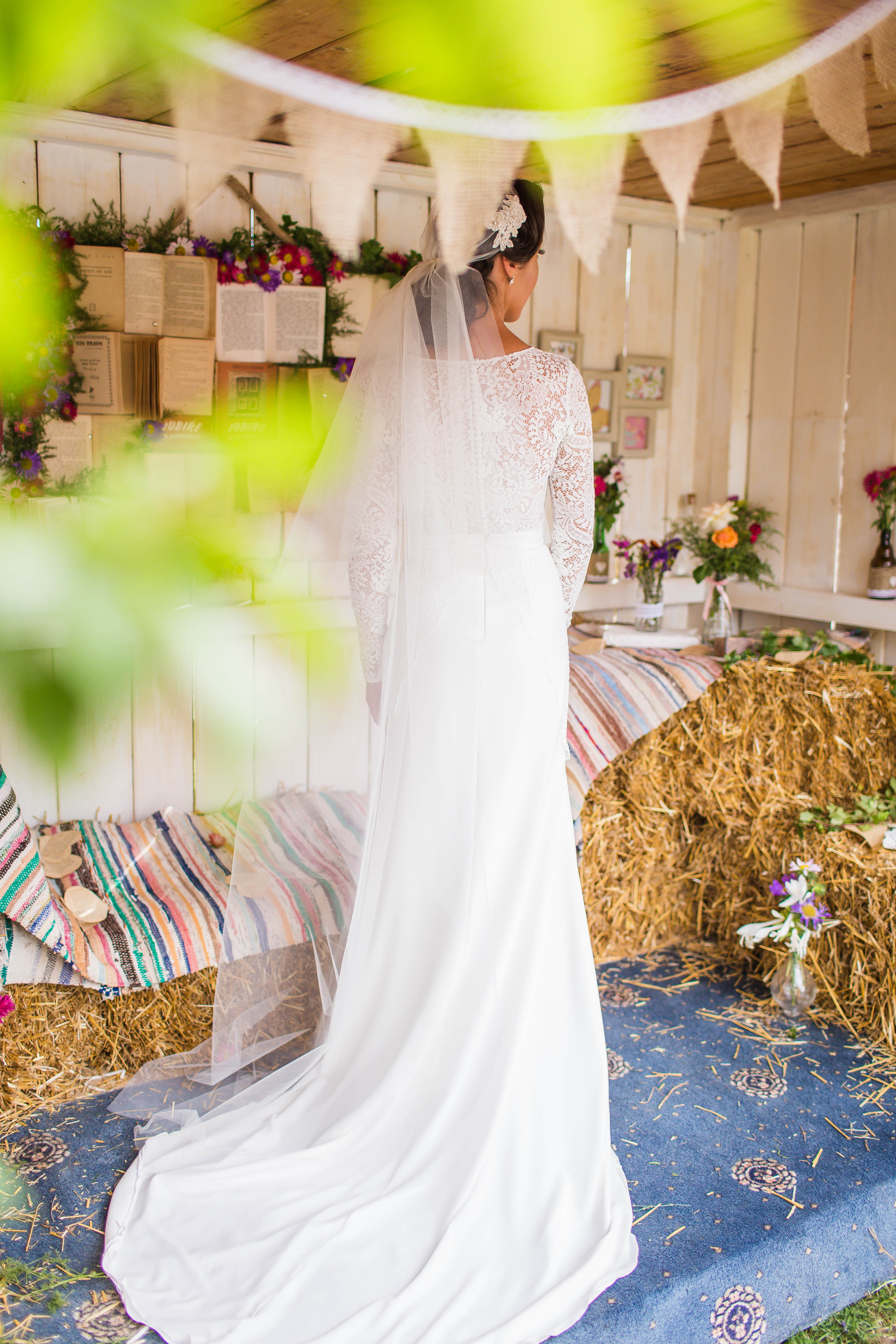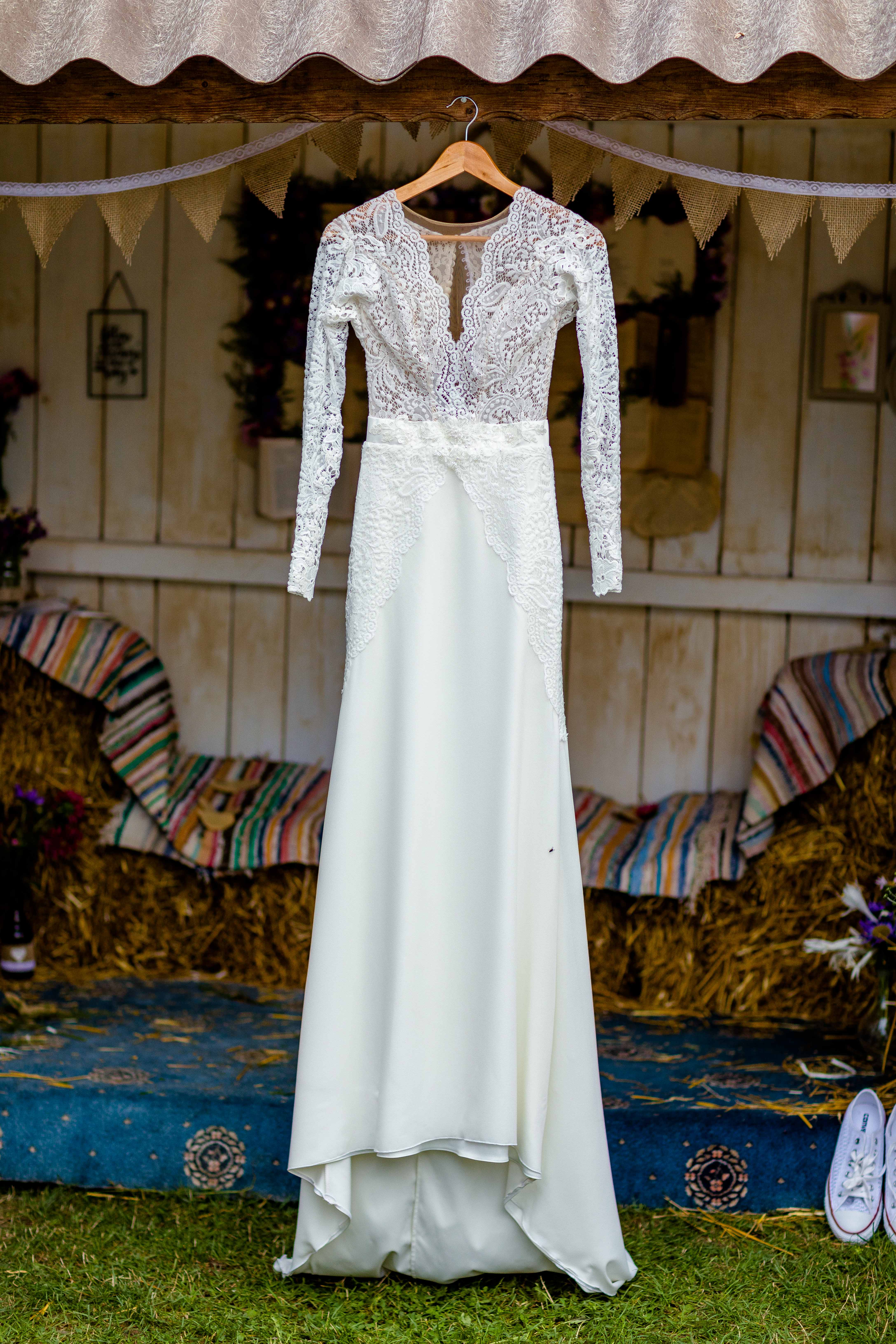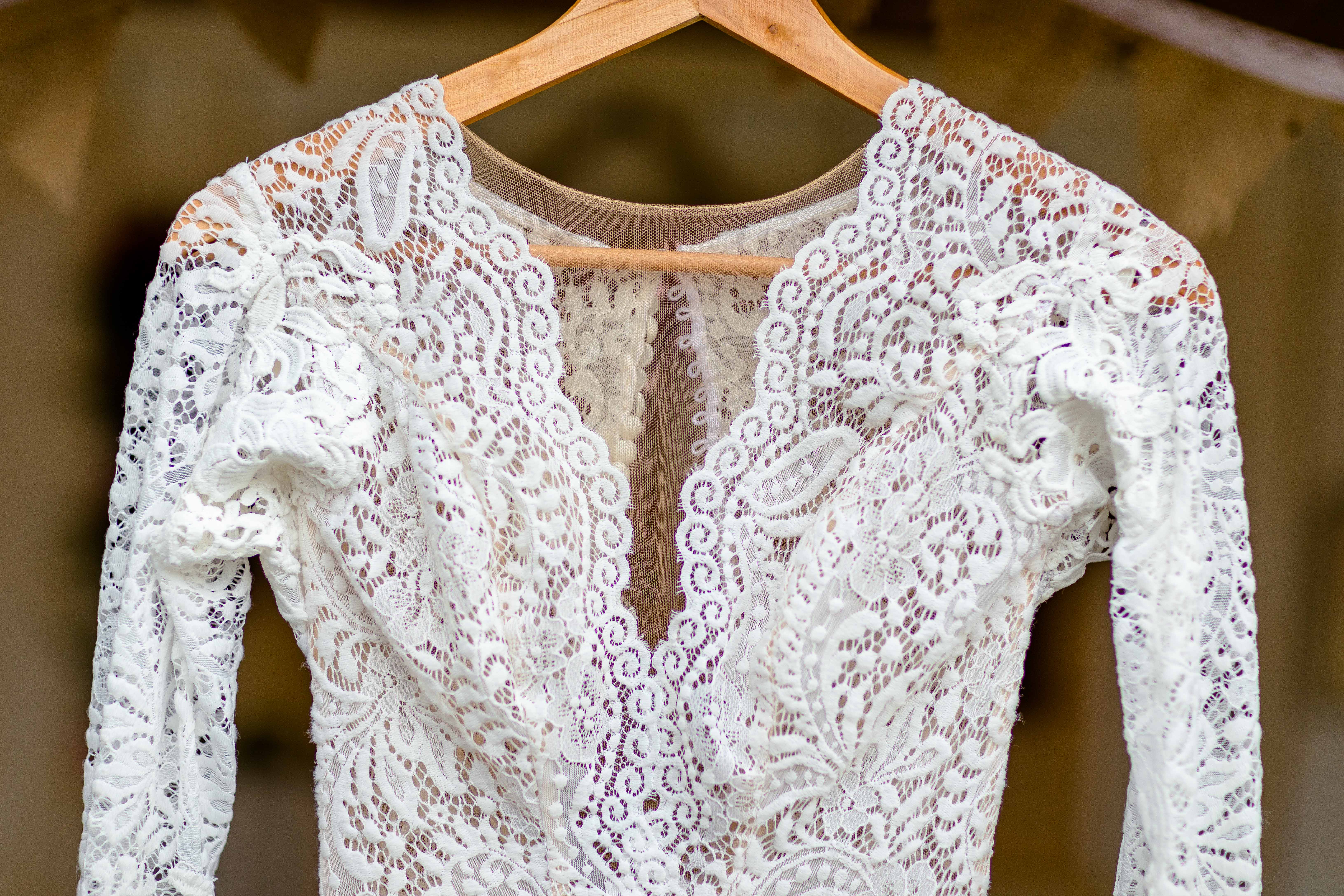 Der Oberstoff ist aus Spitze und der Unterstoff ist aus eine elastische Ware. Die Schleppe kann man mit kleinen Knöpfen nach oben(drin) gebracht werden. Der Überrock kann man schnell und einfach anziehen oder ausziehen. Zwischen der Brust befindet sich ein transparent Tüllstoff. In der Taille gibt es einen Gürtel mit Kieselsteine.