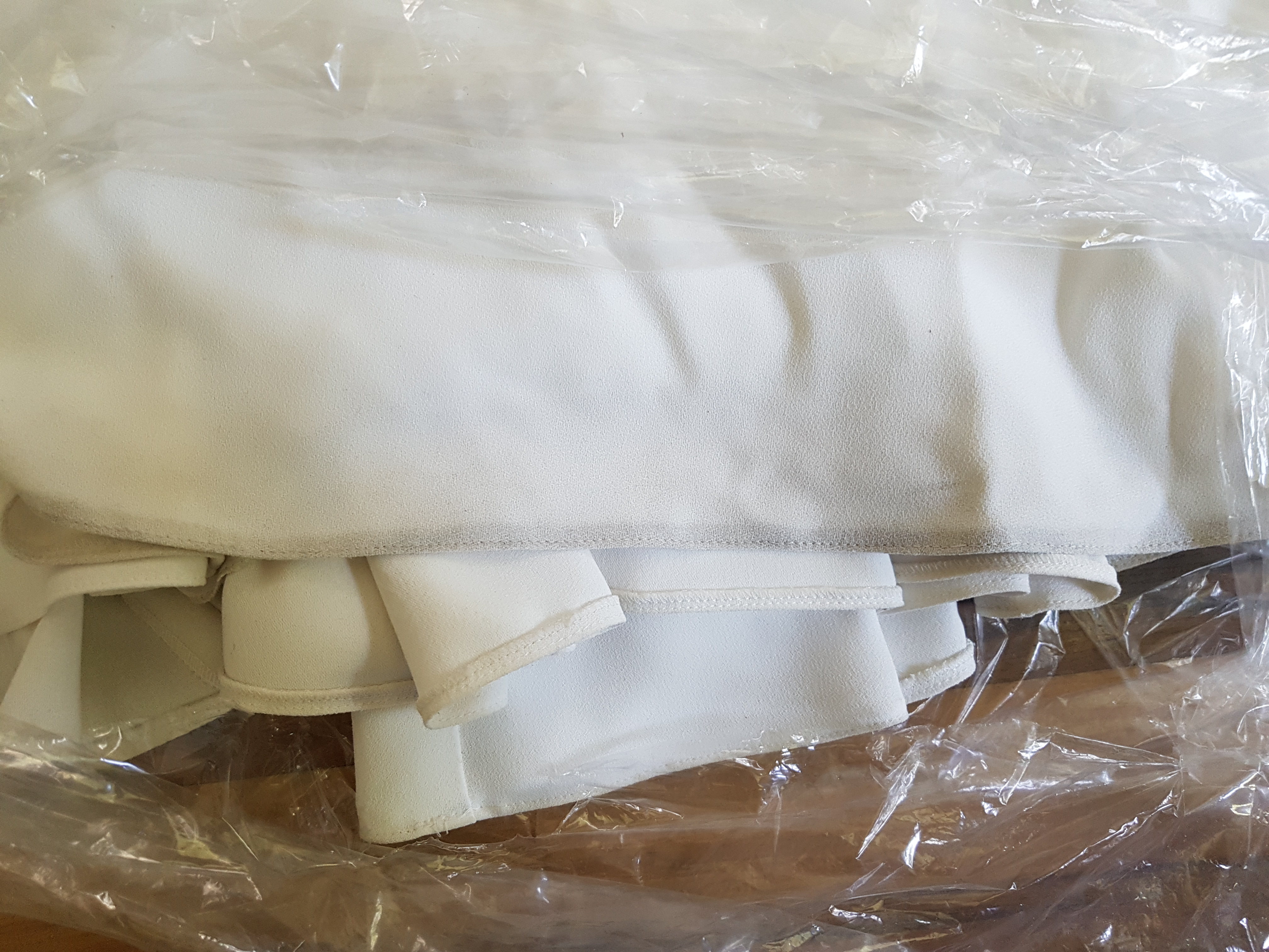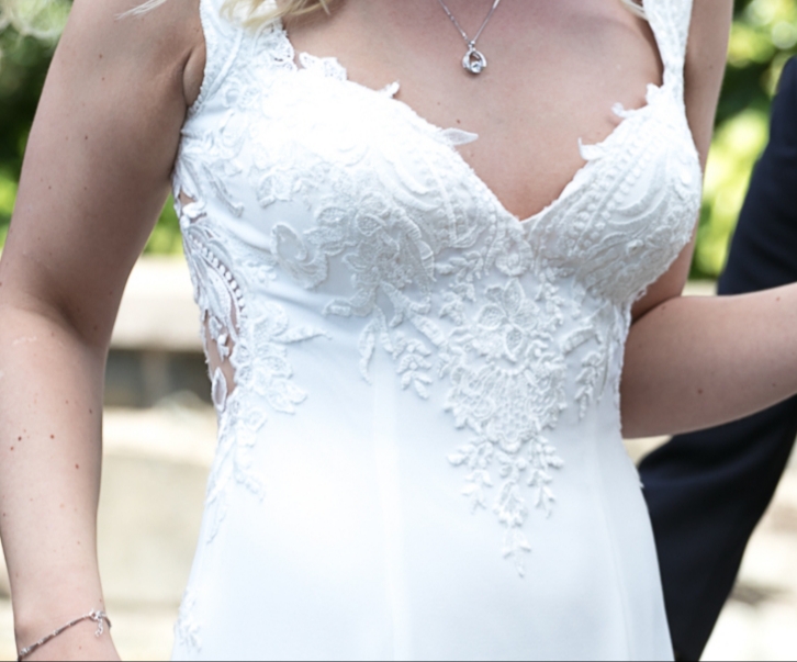 Dieses Kleid wurde 1x am Tag meiner Hochzeit getragen und danach professionell gereinigt. Am Saum der Schleppe konnten nicht alle Verschmutzungen restlos entfernt werden (s. Foto ). Ich empfehle deshalb, das Kleid um den letzten cm zu kürzen. Ansonsten ist das Kleid in einem top Zustand!