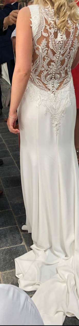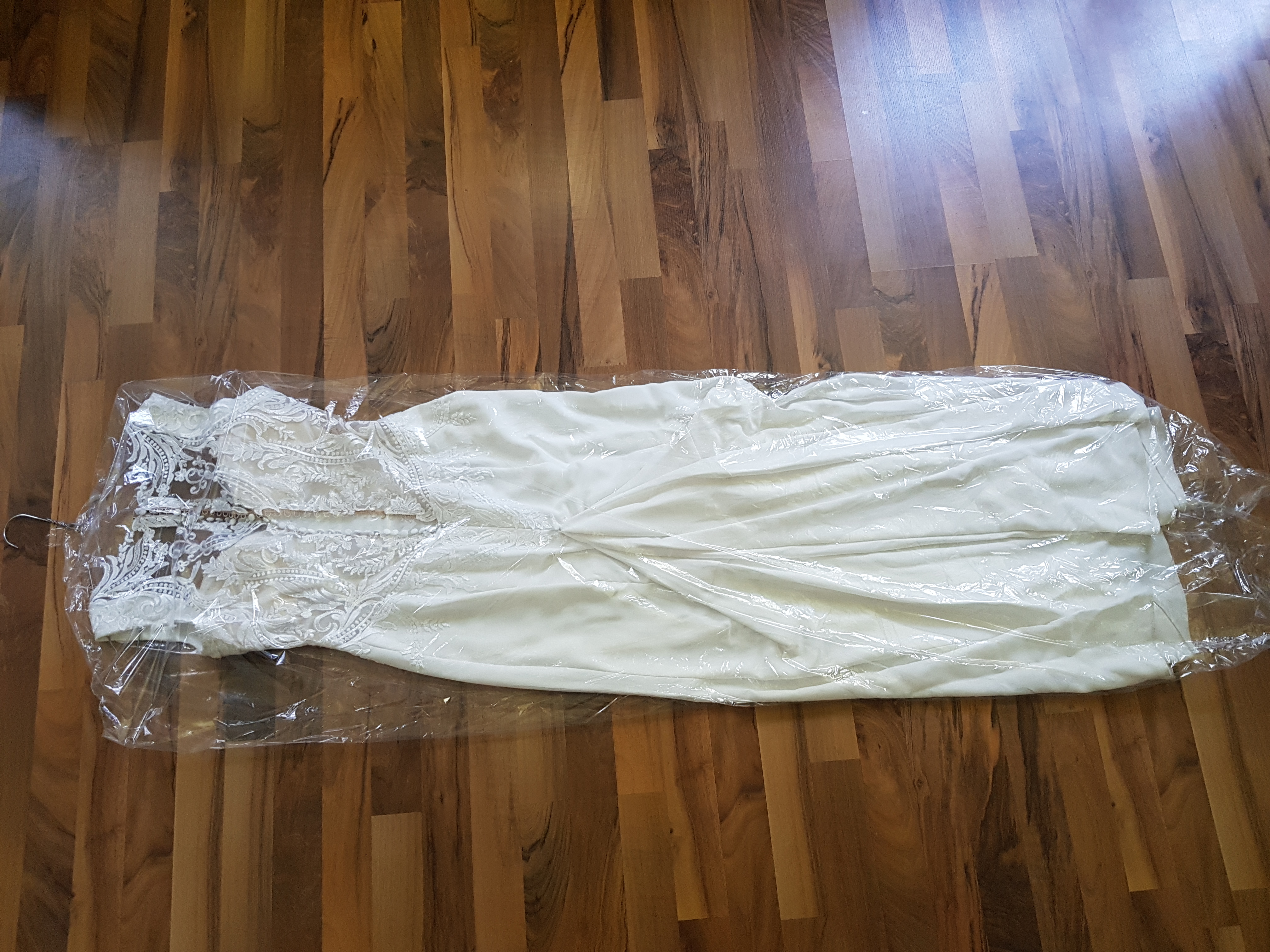 Es hat eine Schleppe, die mit einem Knopf oben fixiert werden kann und der transparente Rücken aus Tattoospitze ist ein absoluter Blickfang. Ein Kleiderschutzbeutel in weiß ist mit dabei.