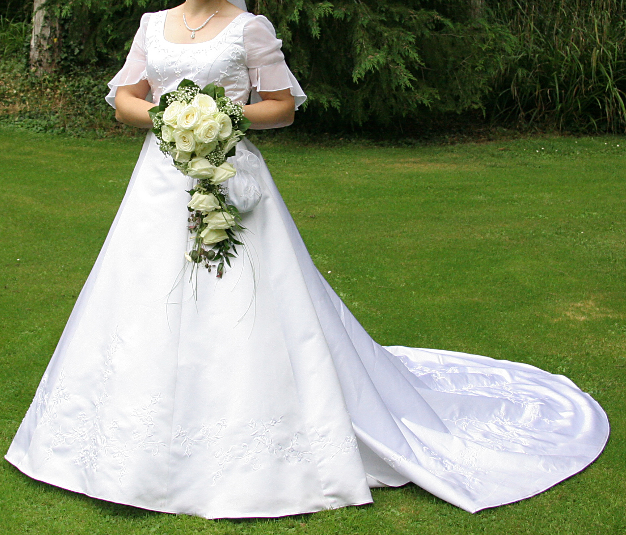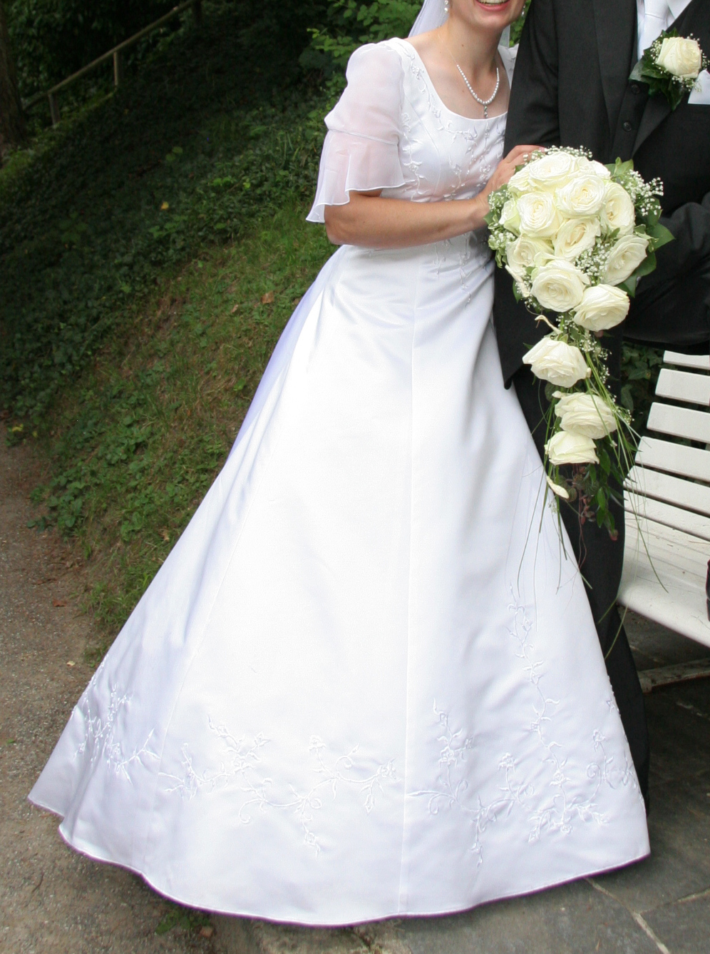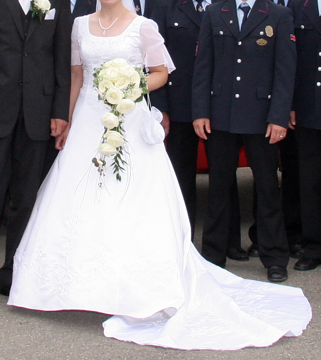 wunderschönes Brautkleid weiß Gr. 38/40, zart bestickt, A-Linie m. hochnehmbarer Schleppe.