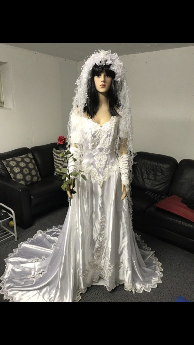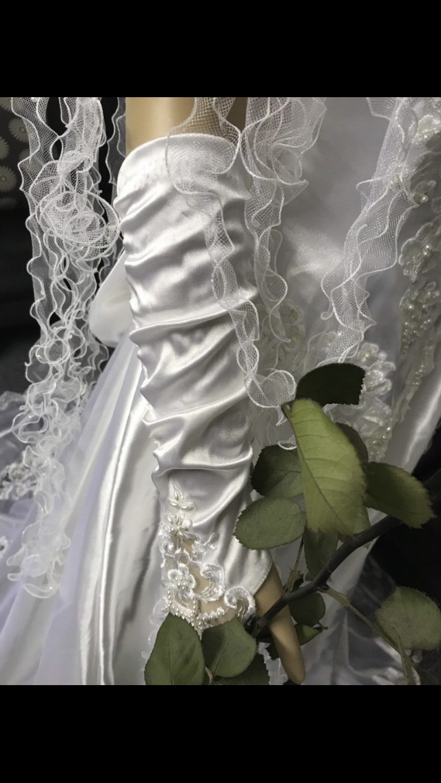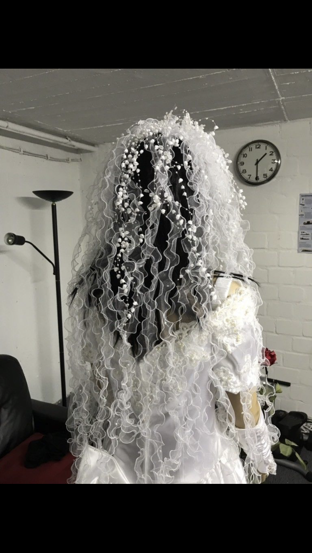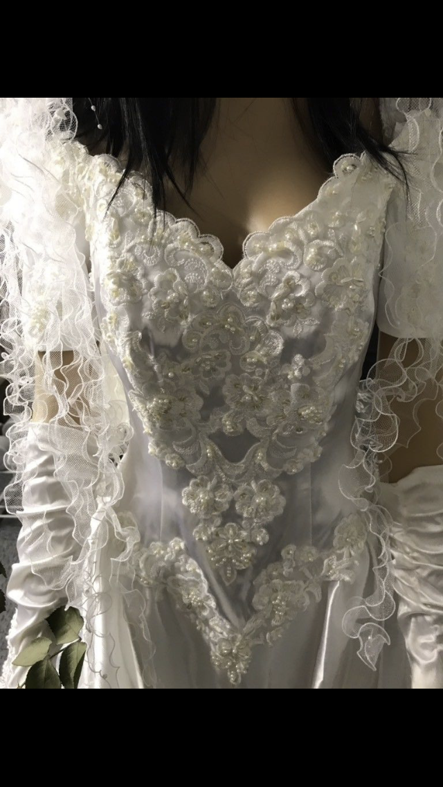 Wunderschönes, traumhaftes Brautkleid, inklusive Schleier und passenden Handschuhen. Die Schleife im Rückenteil ist mit einem kleinen Druckknopf zu verschließen. Der Schleier wird durch einen Haarkamm gehalten und ist leicht zu befestigen. Das Brautkleid wurde frisch gereinigt.